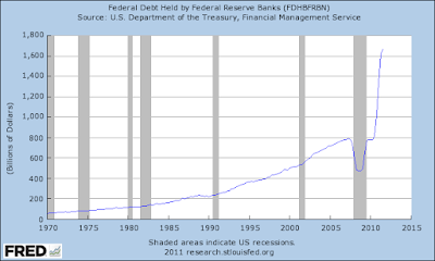 המצב גרוע אפילו עוד יותר, אנחנו למעשה נצטרך לממן את החובות האלו כמעט עד שארית חיינו - זה לא אולי ולא נתון תחת סימן שאלה,זו עובדה: בשיטה המוניטארית הנוכחית ממשלות לעולם לא יוכלו להחזיר את כל חובן או לבטל את הגרעון המצטבר בהן הן נמצאות. ההפך הוא הנכון - הן יאלצו לאורך זמן רק להלוות עוד ועוד כדי שיוכלו להחזיר את הריביות הנלוות לחובות האלו וזאת אם ברצונן להמשיך לקיים את המערכת הכלכלית העכשווית. ככל שהחוב יגדל כך יגדל גם קצב ועוצמת ההתערבות של הבנקים המרכזיים,שיחליפו בהדרגה משקיעים חיצוניים, ברכישת אותו חוב של מדינתם. הסיבה היא שאף גורם חיצוני אחר לא ירצה להסתכן ברכישת חוב בדרגת סיכון הולכת וגדלה. הבנקים המרכזיים בלית ברירה יהיו חייבים לרכוש את אותו חוב על מנת שהמדינה תוכל להמשיך לקיים עצמה. כך הבנקים המרכזיים יהפכו בעצם לנושים הגדולים של אזרחיהם. די לראות את כמות החובות שהפד רכש כדי להבין את המגמה- בגרף הבא שנוצר אחרי תוכנית התמריצים הראשונה (QE1) רואים שהפד עקף אפילו את סין ברשימת מחזיקי החוב האמריקאי והוא היום הנושה מס.1 של אזרחי ארה"ב